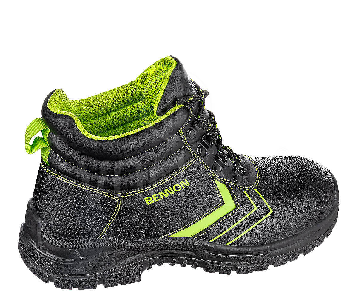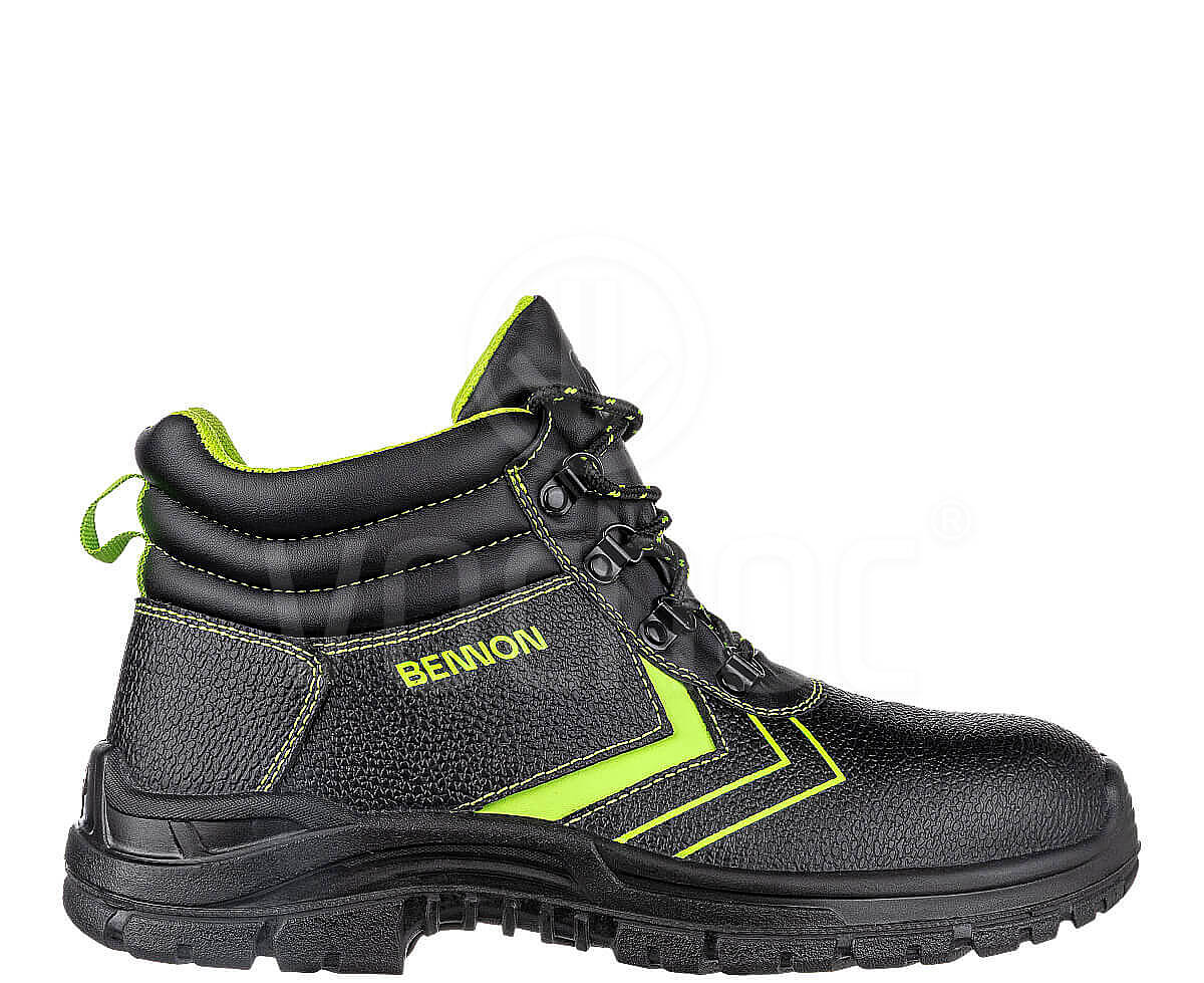 Obuv Bennon BASIC S3 HIGH, která obsahuje bezpečnostní ocelovou tužinku a planžetu.Tato dobře padnoucí bezpečnostní obuv je vyrobena na pohodlném (širokém) kopytě nachází univerzální využití v různých typech venkovních i vnitřních provozů. Svršek z hovězinové usně s hydrofobní úpravou odolávající působení vody. Stélka je anatomicky tvarovaná. Obuv splňuje požadavky kategorie S3 na uzavřenou patní část, antistatické vlastnosti, absorbci energie v oblasti paty, na průnik a absorbci vody, odolnost proti pohonným látkám, test pro práci na žebříku, odolnost vůči propíchnutí, podešev s dezénem.
