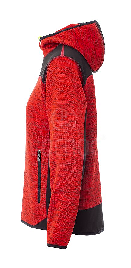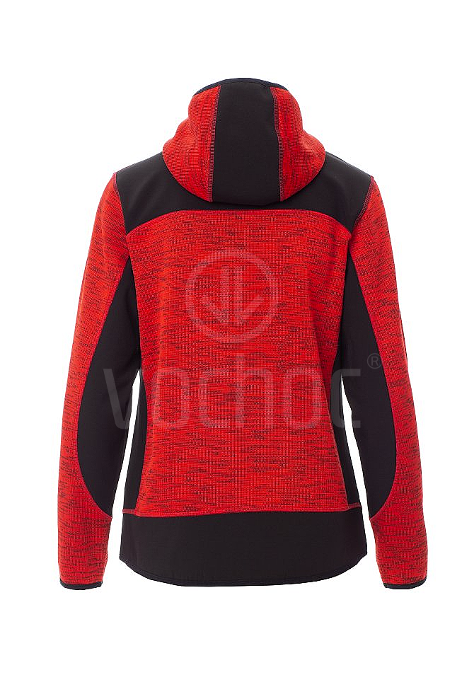 Dámská softshellová mikina, utěsněný celozip SBS, tvarovaná kapuce s dvojitým prošitím, tenký lem na zápěstí a v pase, dvě postranní kapsy na zip, jedna kapsa na hrudi. Úplet s vsadkami z černého softshellu.