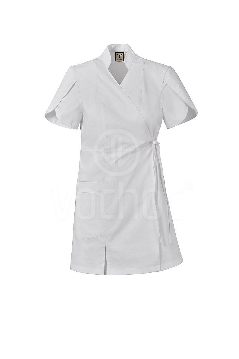 Elegantní a pohodlný dámský plášť s krátkým rukávem v moderním tulipánovém střihu a se šálovým límcem. Je vyroben z kvalitní směsi bavlněného popelínu, polyesteru a vlákna Lycra® T400®, která zajišťuje výjimečnou pružnost, tvarovou stálost a vysokou prodyšnost i při celodenním nošení.