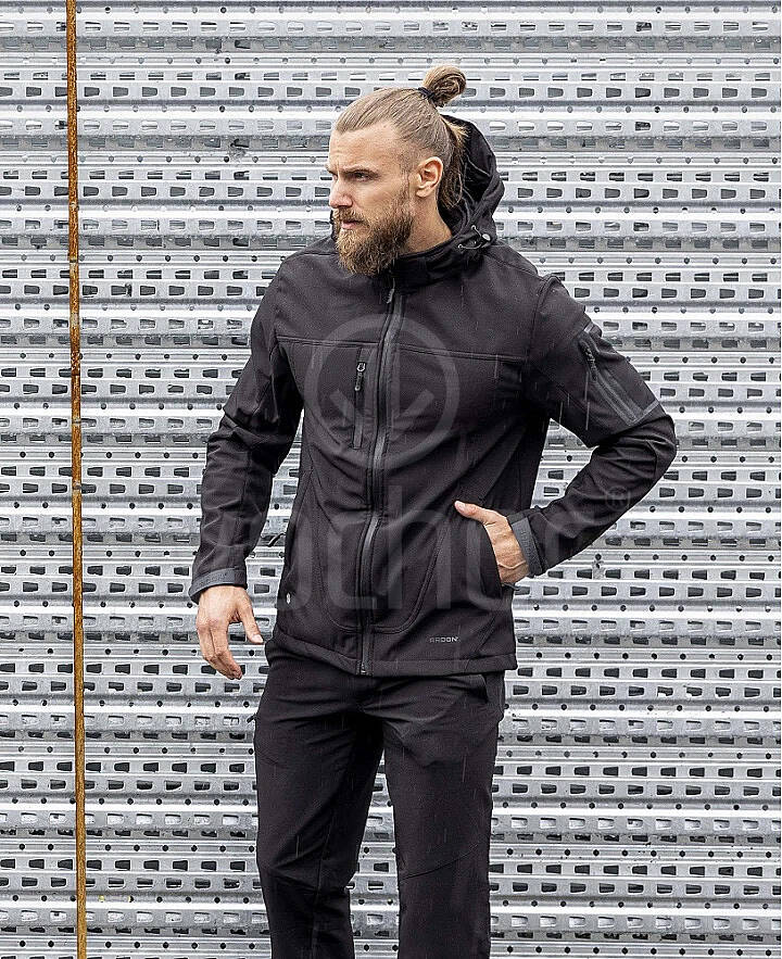 Pánská softshellová bunda s odepínatelnou kapucí. Bunda má na spodním lemu a v kapuci stahování, kapsy na zip, kapsička na levém rukávu a regulovatelné manžety na upravení šířky. Voděodolné zipy, TPU membrána, voděodolnost 10 000 mm, MPV 3000 g/m2/24 hod.