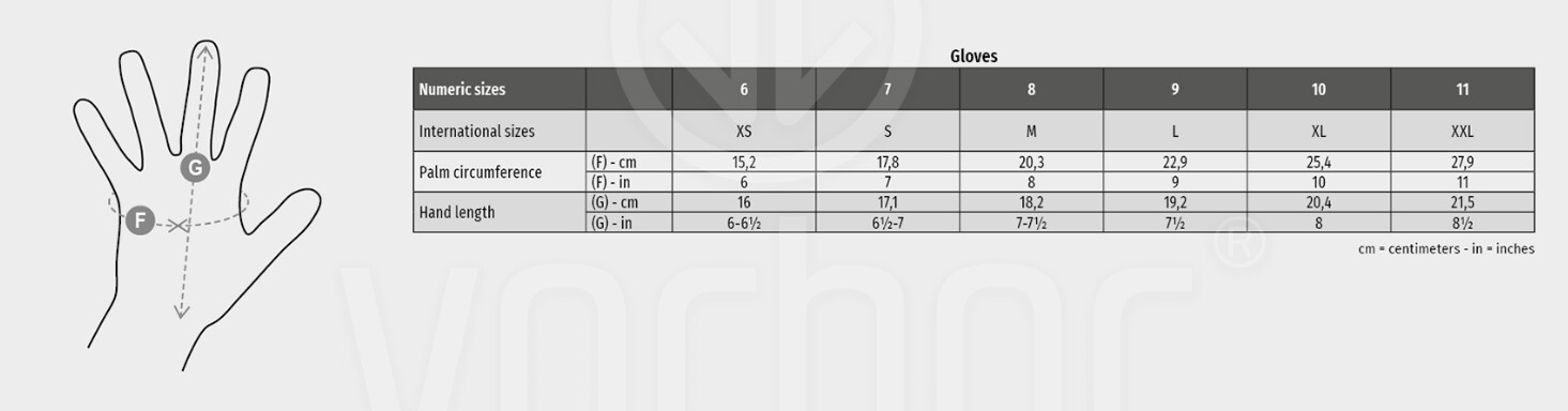 Vnitřní podšívka: pletená tkanina (hřbet), gázovaná tkanina (dlaň), návlek z drill tkaniny