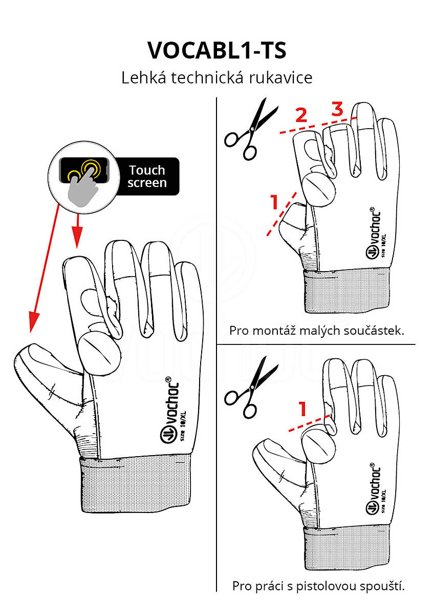 Špičkové pracovní kombinované rukavice VOCABL1TS pro obsluhu dotykových zařízení. Rukavice byly vyvinuté pro přesnou a pohodlnou práci s ručním nářadím a montáž součástek. Poskytují vysokou citlivost a komfort spojené s dlouhou životností a velmi dobrou úrovní ochrany uživatele.