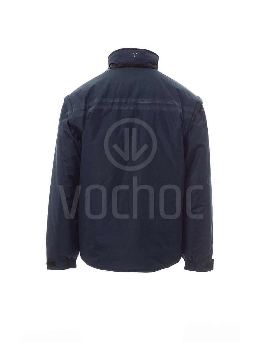 Pánská bunda s odepínacími rukávy. Plastový 5mm zip s kovovým jezdcem zakrytým klopu s plastovými knoflíky, kapuce balitelná do límce, stahovací manžety, reflexní pruhy, sladěné barvy na přední a zadní straně, boční rozparky s klínkem a zipem. Pět vnějších kapes, jedna s oboustranným pouzdrem na jmenovku. Zateplený vnitřek, mikrofleecový límec, záda a spodní část, prodyšné vsadky v podpaží, stahovací šňůrka v pase a zip na vnitřní straně pro snadnější potisk a vyšívání.